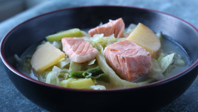 Inspired by the classic Finnish salmon soup Lohikeitto, this creamy soy milk salmon soup reinterprets Nordic comfort food through the lens of Quebec’s winter harvest, using leek, cabbage, and rutabaga. The natural sweetness of local root vegetables pairs beautifully with tender salmon, while soy milk replaces cream to create a lighter, dairy-free texture. Nourishing and gently warming, this soup is ideal for cold Montreal winters and for anyone seeking a healthy fish recipe rooted in seasonal ingredients.