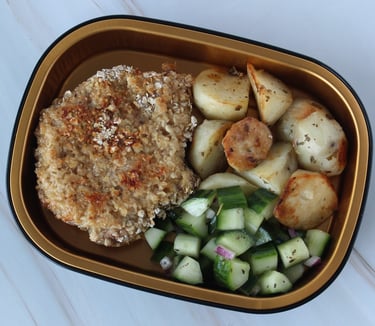Love Project Edition 3: A Warm Meal for a Stranger in –9°C Montreal (Gluten-Free Oat Flake Coated Pork Chop with Baked Spiced Potatoes and Fresh Cucumber Salad)