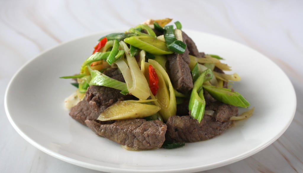 Slice the leek, red chili, garlic, and ginger as specified above. Keep them separate from the marinated beef.